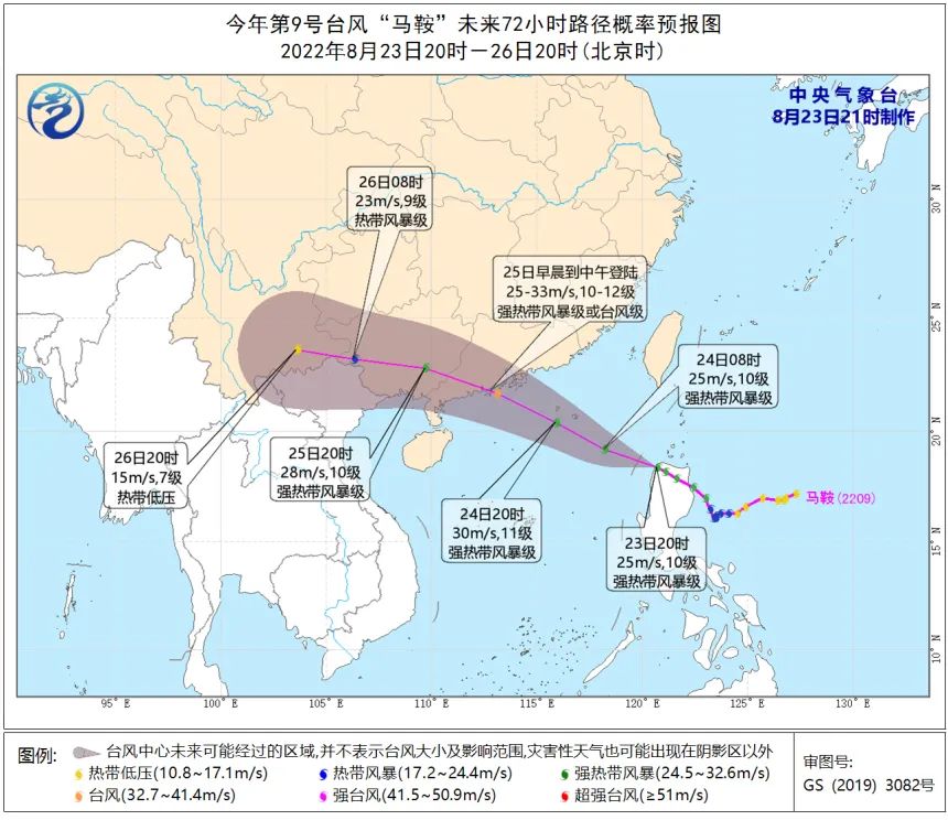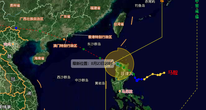中央氣象臺8月23日發(fā)布臺風(fēng)黃色預(yù)警:今年第9號臺風(fēng)“馬鞍”(強(qiáng)熱帶風(fēng)暴級)的中心23日20時(shí)位于菲律賓呂宋島境內(nèi),預(yù)計(jì),將以每小時(shí)20-25公里的速度向西北方向移動(dòng),24日凌晨移入南海東北部海面后逐漸向廣東沿??拷?,強(qiáng)度逐漸增強(qiáng),最強(qiáng)可達(dá)強(qiáng)熱帶風(fēng)暴級或臺風(fēng)級,并將于25日早晨到中午在廣東惠州至電白一帶沿海登陸(10-12級,強(qiáng)熱帶風(fēng)暴級或臺風(fēng)級),登陸后強(qiáng)度逐漸減弱。