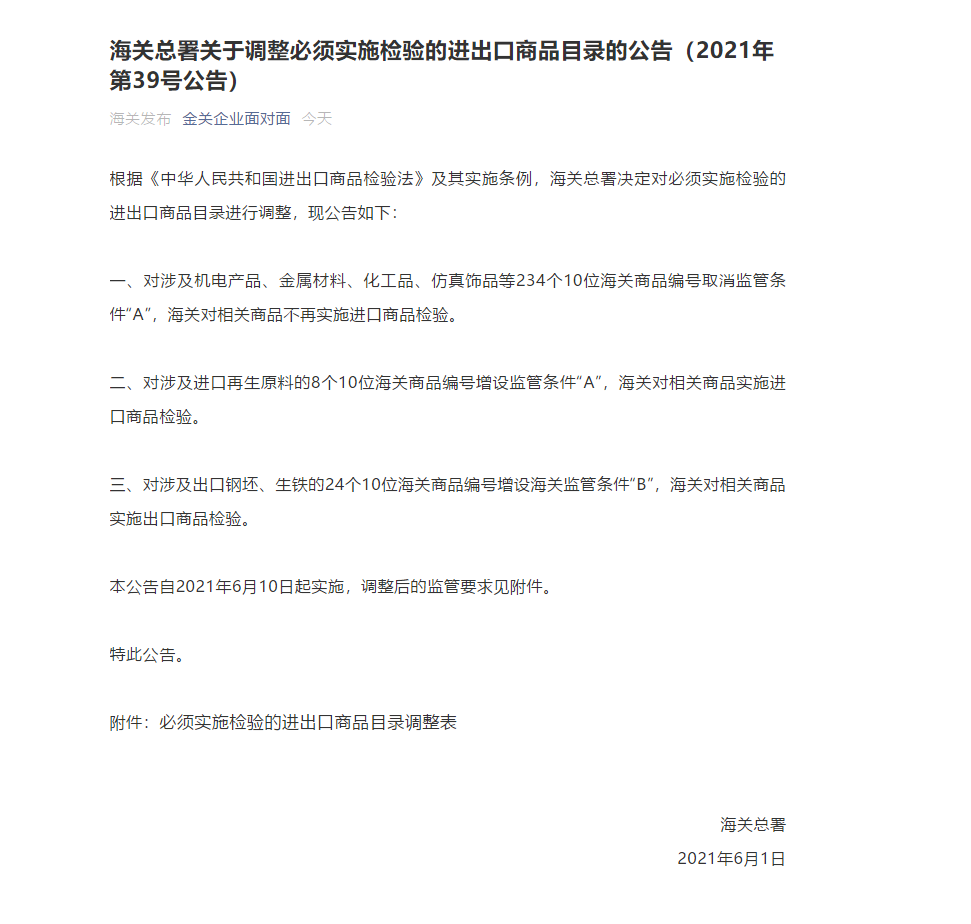 海關(guān)總署關(guān)于調(diào)整必須實(shí)施檢驗(yàn)的進(jìn)出口商品目錄的公告(2021年第39號(hào)公告)