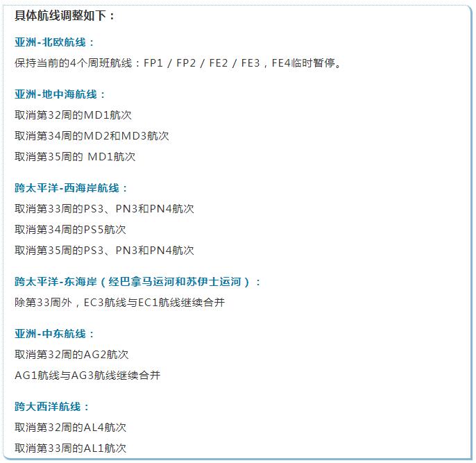 根據(jù)區(qū)域來(lái)看, 亞洲-美西航線共計(jì)減少6條停航,地中海航線共計(jì)減少1條停航;北歐航線無(wú)變化,美東航線新增2條停航。