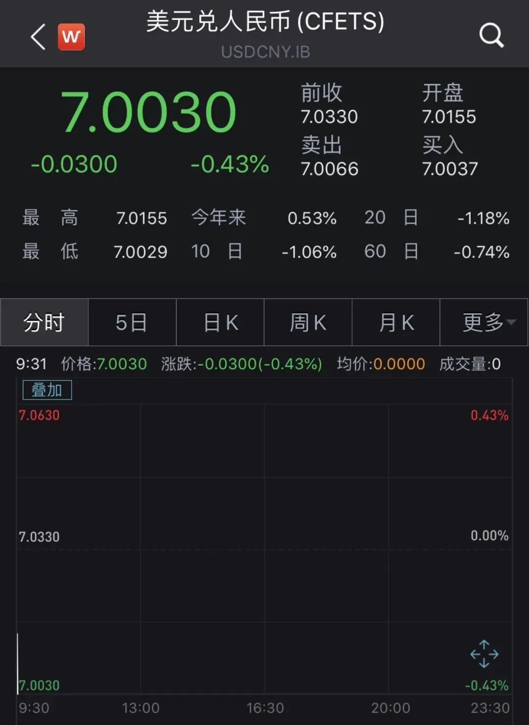 7月6日,人民幣對(duì)美元匯率在離岸和在岸市場(chǎng)接連升破7.06、7.05、7.04、7.03四道關(guān)口,日內(nèi)漲幅均接近500個(gè)基點(diǎn)。