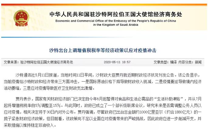 面對(duì)新冠疫情危機(jī)和其引發(fā)的全球性經(jīng)濟(jì)衰退,大多數(shù)國(guó)家都推出了擴(kuò)張性財(cái)政刺激計(jì)劃,以提振國(guó)內(nèi)經(jīng)濟(jì)活動(dòng)。沙特阿拉伯公布了一項(xiàng)計(jì)劃,將其增值稅增加三倍,從7月1日開(kāi)始,將增值稅(VAT)的稅率從5%提高到15%,以增加額外財(cái)政收入。高貨值訂單(超過(guò)1000里亞爾,約合266.4美金)在沙特阿拉伯清關(guān)時(shí),將產(chǎn)生進(jìn)口增值稅和關(guān)稅,進(jìn)口增值稅(VAT)稅金金額按照買(mǎi)家實(shí)際支付金額x15%計(jì)算,關(guān)稅由海關(guān)根據(jù)不同商品的應(yīng)稅稅率計(jì)算。沙特國(guó)家統(tǒng)計(jì)總局6月30日公布的統(tǒng)計(jì)數(shù)據(jù)顯示,沙特第一季度國(guó)民生產(chǎn)總值較去年同期下降1%。數(shù)據(jù)顯示,一季度非石油行業(yè)的增長(zhǎng)率為1.6%,但石油部門(mén)的增長(zhǎng)率為-4.6%。