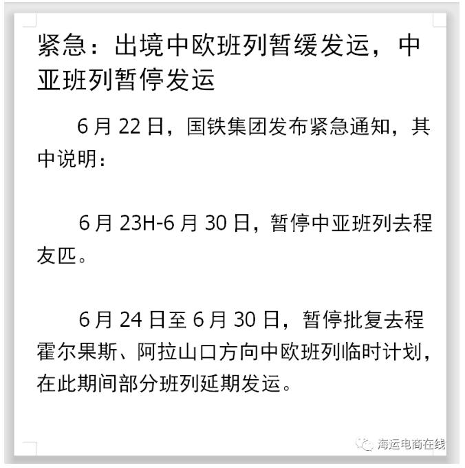 6月24日—6月30日,暫停批復(fù)去程霍爾果斯、阿拉山口方向中歐班列臨時(shí)計(jì)劃,以及在此期間部分班列延期發(fā)運(yùn)。