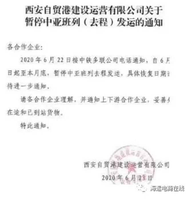 除了成都站點(diǎn),西安等站點(diǎn)6月下旬也陸續(xù)曾發(fā)布過(guò)暫停中亞班列去程發(fā)運(yùn)的相關(guān)通知,提醒上下游合作企業(yè)妥善安排好在途和已經(jīng)到站的貨物,并密切關(guān)注班列運(yùn)行情況的變化,及時(shí)有效應(yīng)對(duì),然而通知中并沒(méi)有給出恢復(fù)正常發(fā)運(yùn)的具體日期。