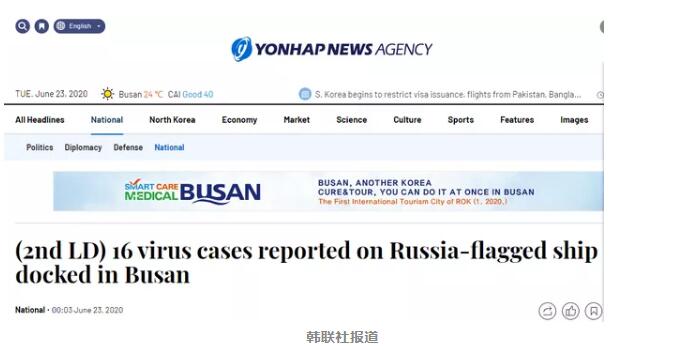 據(jù)韓聯(lián)社23日報道,這艘船來自俄羅斯海參崴(符拉迪沃斯托克)。于本月19日上午開始停泊在釜山市甘川港。韓國方面獲悉,該船船長約一周前因發(fā)燒返回俄羅斯,并確診感染新冠病毒。隨后,檢疫所對船上的船員進行了檢測。防疫部門認(rèn)為,船長很可能是這起群聚疫情的感染源。