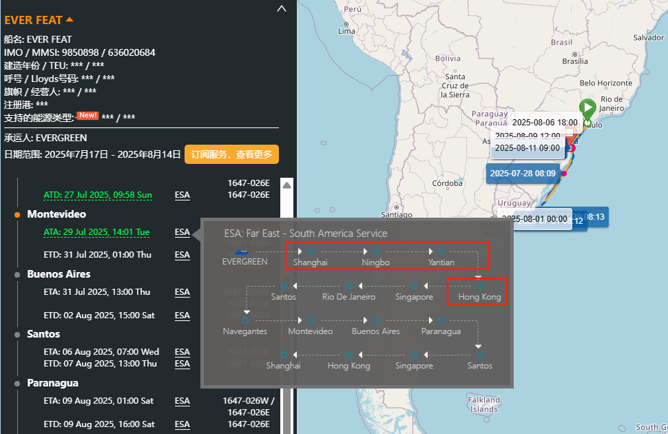 “Ever Feat”輪部署在遠(yuǎn)東-南美的ESA航線,事發(fā)時(shí)正執(zhí)行1647-026W航次。該輪涉及共艙的船公司有海洋聯(lián)盟的長(zhǎng)榮、中遠(yuǎn)、OOCL、達(dá)飛,以及太平船務(wù)和陽明海運(yùn)。該輪于6月14日掛靠上海、6月17日掛靠寧波、6月21日掛靠鹽田港和香港等中國(guó)港口,隨后裝載中國(guó)貨物駛往南美。