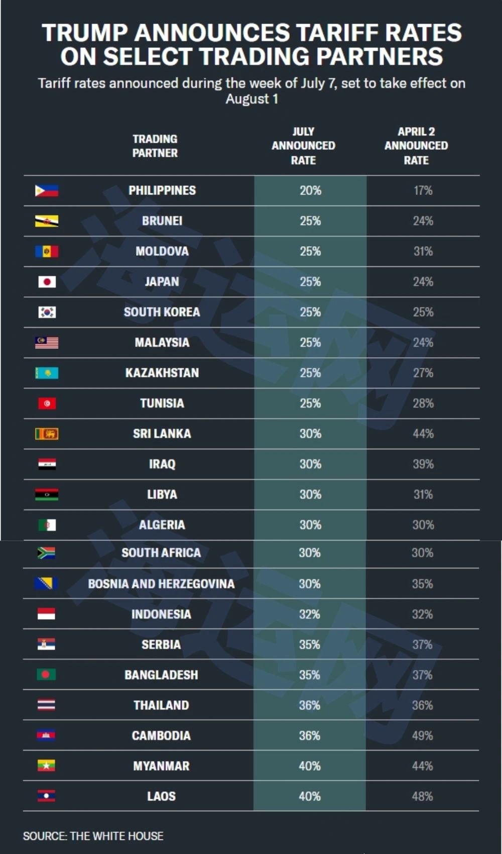 7月9日深夜,美國總統(tǒng)特朗普公布新一輪關(guān)稅通知函,對(duì)菲律賓、利比亞、阿爾及利亞和伊拉克等國征收20%至30%不等的關(guān)稅。宣布計(jì)劃自8月起,對(duì)未能與美國達(dá)成協(xié)議的貿(mào)易伙伴的進(jìn)口商品征收關(guān)稅,這標(biāo)志著其4月份宣布暫停征收的“互惠”關(guān)稅正式結(jié)束。