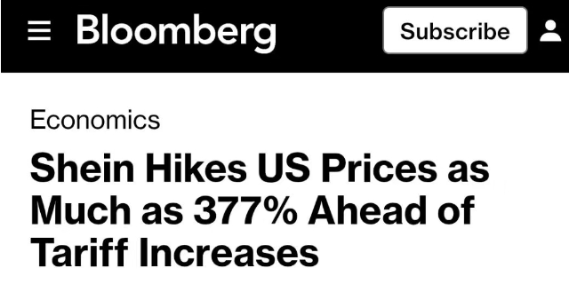 據悉,Shein將美國市場部分商品價格最高上調至377%。