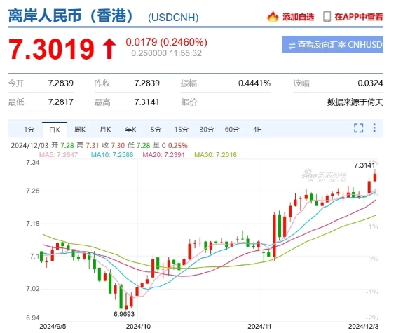 12月3日,離岸人民幣對(duì)美元匯率開(kāi)盤后即先后跌破7.29、7.30、7.31三大關(guān)口,盤中最低至7.3153。