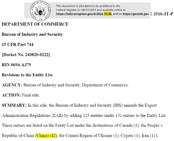 日前,美國擴大涉俄出口管制。美國商務部下屬的工業(yè)和安全局(BIS)宣布更新出口管制規(guī)則,并將131個名錄下的123個實體添加到“實體清單”(Entity List)中,進行嚴格的出口管制,其中包括42個中國實體和地址。