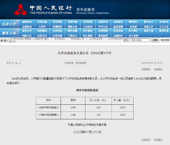 消息面上,2024年8月29日,人民銀行以數(shù)量招標(biāo)方式進(jìn)行了公開市場業(yè)務(wù)現(xiàn)券買斷交易,從公開市場業(yè)務(wù)一級交易商買入4000億元特別國債。