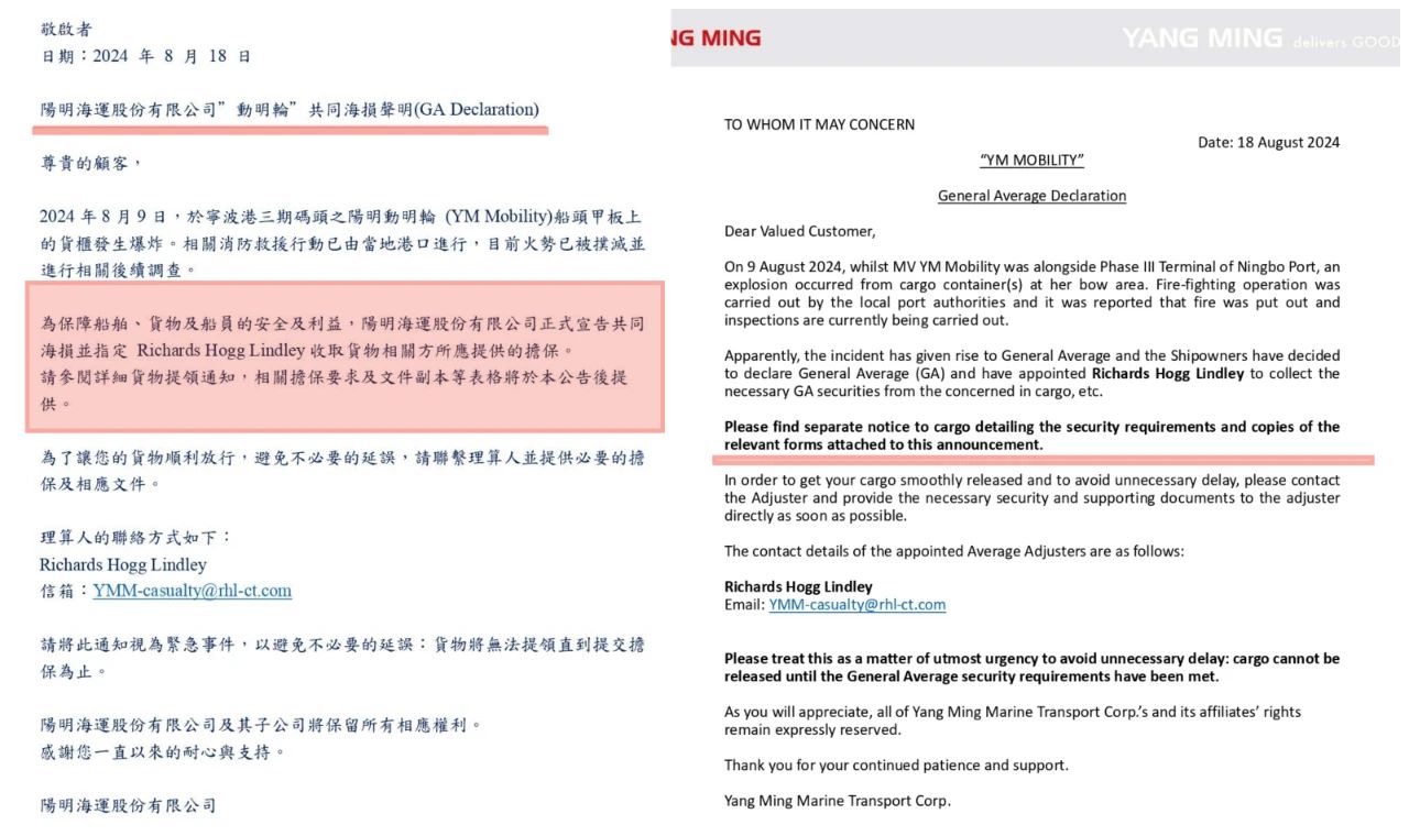 據(jù)陽(yáng)明海運(yùn)介紹,事故發(fā)生后,寧波港港埠主管機(jī)關(guān)與當(dāng)?shù)叵罊C(jī)構(gòu)迅速響應(yīng),采取了有效的應(yīng)急措施,并在專業(yè)指導(dǎo)下成功控制了火勢(shì),直至公告發(fā)布時(shí),事故已得到完全處理。關(guān)于事故的具體原因,陽(yáng)明海運(yùn)表示將交由第三方專業(yè)機(jī)構(gòu)進(jìn)行深入調(diào)查。為保障船舶、貨物及船員的安全及利益,以及妥善處理后續(xù)事宜,陽(yáng)明海運(yùn)已按照共同海損理算規(guī)則,宣告此次事故為共同海損,并指定Richards Hogg Lindley作為理算人,負(fù)責(zé)相關(guān)事宜的處理,包括收取貨物相關(guān)方所應(yīng)提供的擔(dān)保。具體請(qǐng)參閱詳細(xì)貨物提領(lǐng)通知,相關(guān)擔(dān)保要求及文件副本等表格將于本公告后提供。
