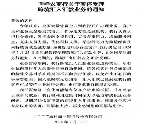 為更好地服務(wù)存量客戶(hù),**農(nóng)商行決定自2024年7月23日零時(shí)起暫停受理跨境匯入?yún)R款業(yè)務(wù),具體恢復(fù)時(shí)間另行通知。