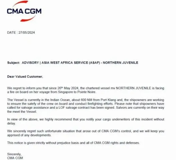 5月27日,達飛發(fā)布公告稱,自2024年5月26日以來,其租賃“NORTHERN JUVENILE”號集裝箱船在從新加坡駛往黑角航行的途中發(fā)生火災(zāi)。