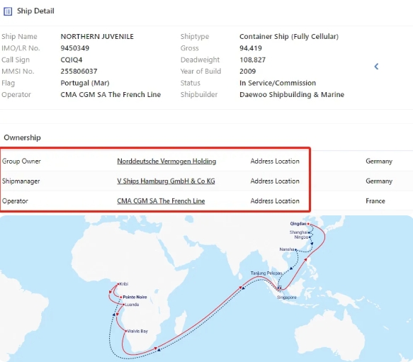 同時船視寶數(shù)據(jù)顯示,該輪船東為德國船舶融資公司Norddeutsche Vermogen,船管公司為德國V.Ships Hamburg GmbH公司,懸掛葡萄牙國旗,建造于2009年,運力8811TEU,部署在達飛的亞洲至西非的ASAFGR(Asia West Africa Service)航線。