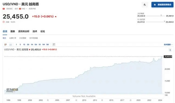 此前,美元對越南盾匯率來到1美元兌25455越南盾的歷史高位,日內(nèi)漲幅為0.06%。今年迄今,美元對越南盾匯率一直處于上行趨勢。上個(gè)月,越南盾一度貶值至1美元兌25365越南盾,當(dāng)時(shí)也創(chuàng)下了歷史高點(diǎn)。