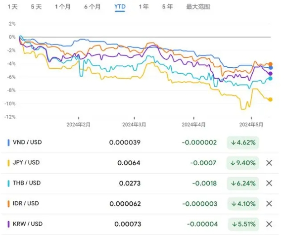彭博社分析稱,在美國利率高企且美聯(lián)儲(chǔ)降息預(yù)期減弱以及地緣政治局勢不斷升級(jí)的情況下,美元一路走高,越南正與諸多亞洲國家一樣面臨貨幣貶值。越南盾之外,日元、印度盧比、印尼盾、泰銖、馬來西亞林吉特、菲律賓比索等亞洲貨幣均持續(xù)走出下行曲線。