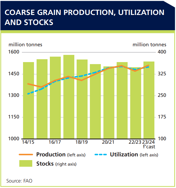 近10年全球粗糧產(chǎn)量、利用量及庫存量變化圖。?糧農(nóng)組織