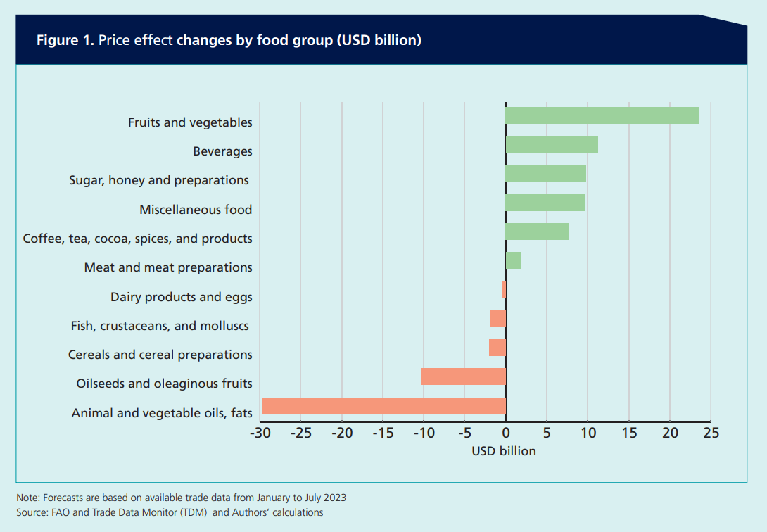 其中,水果、蔬菜以及飲料和食糖對增量的貢獻顯著,其進口量的增長則主要由高收入和中高收入國家推動。相比之下,低收入國家的糧食進口總額預(yù)計將減少11%。這些變化往往可以反映世界價格趨勢:本年度水果、蔬菜和食糖的國際報價猛漲,而動物油與植物油的報價則有所下降。盡管如此,全球糧食進口賬單上進口量的變化帶來的影響預(yù)計大于價格變化的影響,不過咖啡、茶、可可和香料等高價值或加工產(chǎn)品除外。