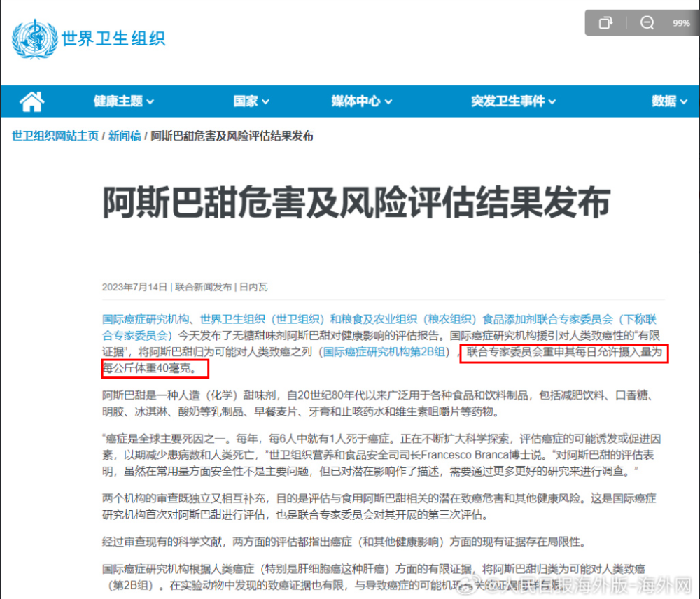 據(jù)世衛(wèi)組織官網(wǎng)14日消息,國際癌癥研究機構(gòu)(IARC)、世界衛(wèi)生組織(WHO)和糧食及農(nóng)業(yè)組織食品添加劑聯(lián)合專家委員會(JECFA)今天發(fā)布了阿斯巴甜對健康影響的評估結(jié)果。