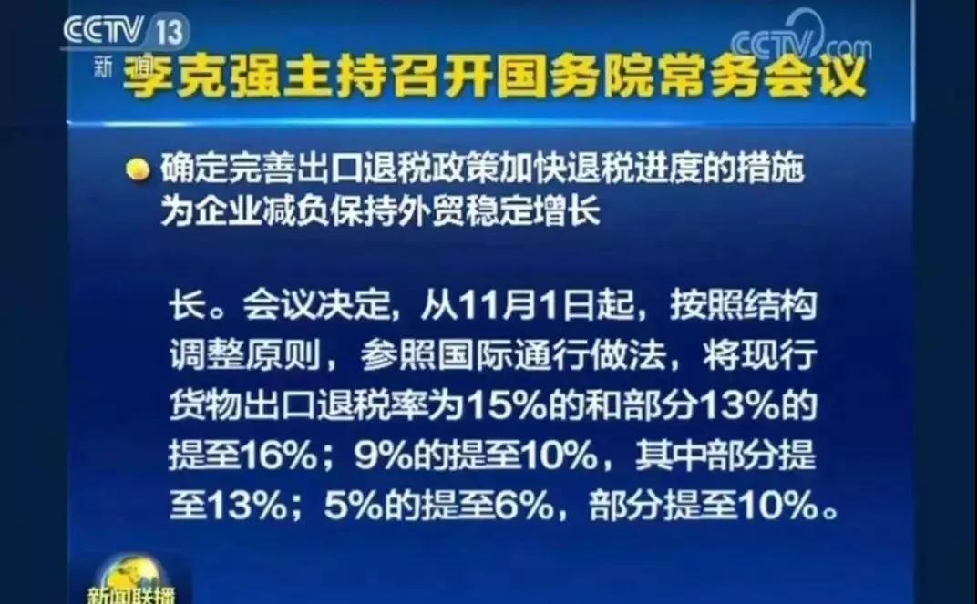 10月8日召開國務(wù)院常務(wù)會議,確定完善出口退稅政策加快退稅進(jìn)度的措施,為企業(yè)減負(fù)、保持外貿(mào)穩(wěn)定增長;