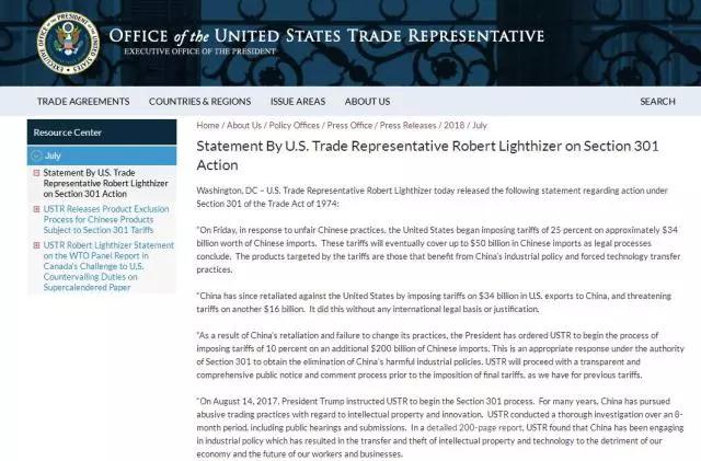 美國貿(mào)易代表羅伯特·萊特希澤在301行動中的發(fā)言