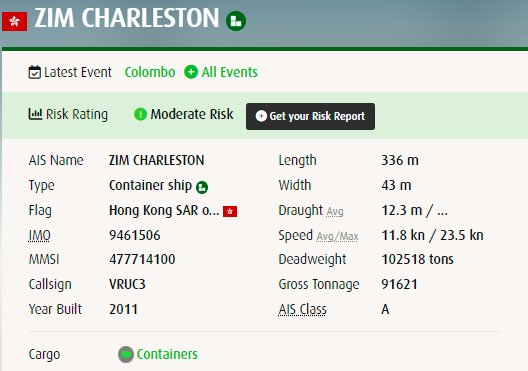 集裝箱船“ZIM CHARLESTON”建造于2011年,懸掛香港區(qū)旗,運力8586TEU,服務于以星亞洲內(nèi)部的China India Express III (CI3)航線,事發(fā)時執(zhí)行7W航次。7月份駛離中國前曾掛靠國內(nèi)多個港口。