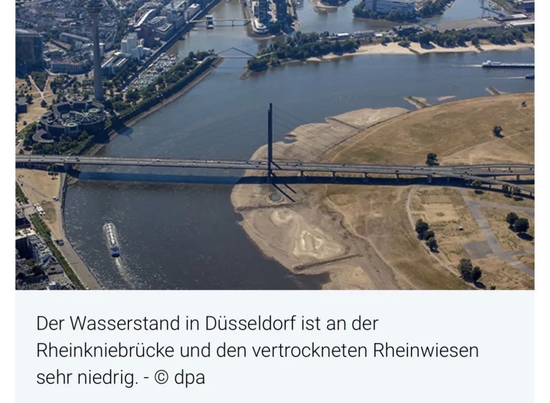 萊茵河下游的局勢也不樂觀。周日下午,科隆的水位只有74厘米,比前一天降低了8厘米。在杜塞爾多夫,萊茵河水位已經(jīng)下降到了34 厘米,24小時內(nèi)下降了9厘米。不過,航道實際深度仍有近兩米的水深。