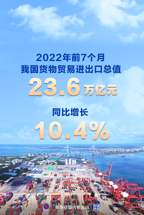 海關(guān)總署8月7日發(fā)布數(shù)據(jù)顯示,2022年前7個(gè)月,我國(guó)貨物貿(mào)易進(jìn)出口總值23.6萬億元,同比增長(zhǎng)10.4%,其中,7月當(dāng)月,進(jìn)出口同比增長(zhǎng)16.6%,延續(xù)了5月份以來外貿(mào)增速持續(xù)回升態(tài)勢(shì),為穩(wěn)定宏觀經(jīng)濟(jì)大盤作出積極貢獻(xiàn)。