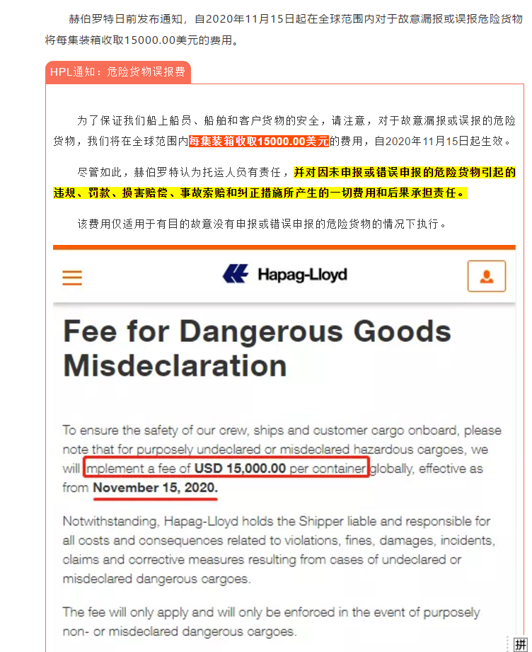 注意!船公司:11月15日起,危險品誤報、瞞報罰款15000$每箱