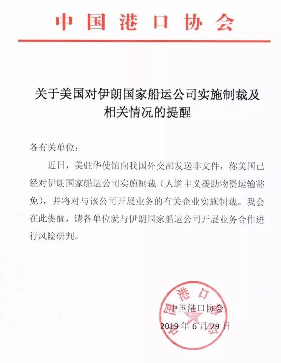 6月29日,中國港口協(xié)會(huì)發(fā)出關(guān)于美國對伊朗國家船運(yùn)公司實(shí)施制裁及相關(guān)情況的提醒。