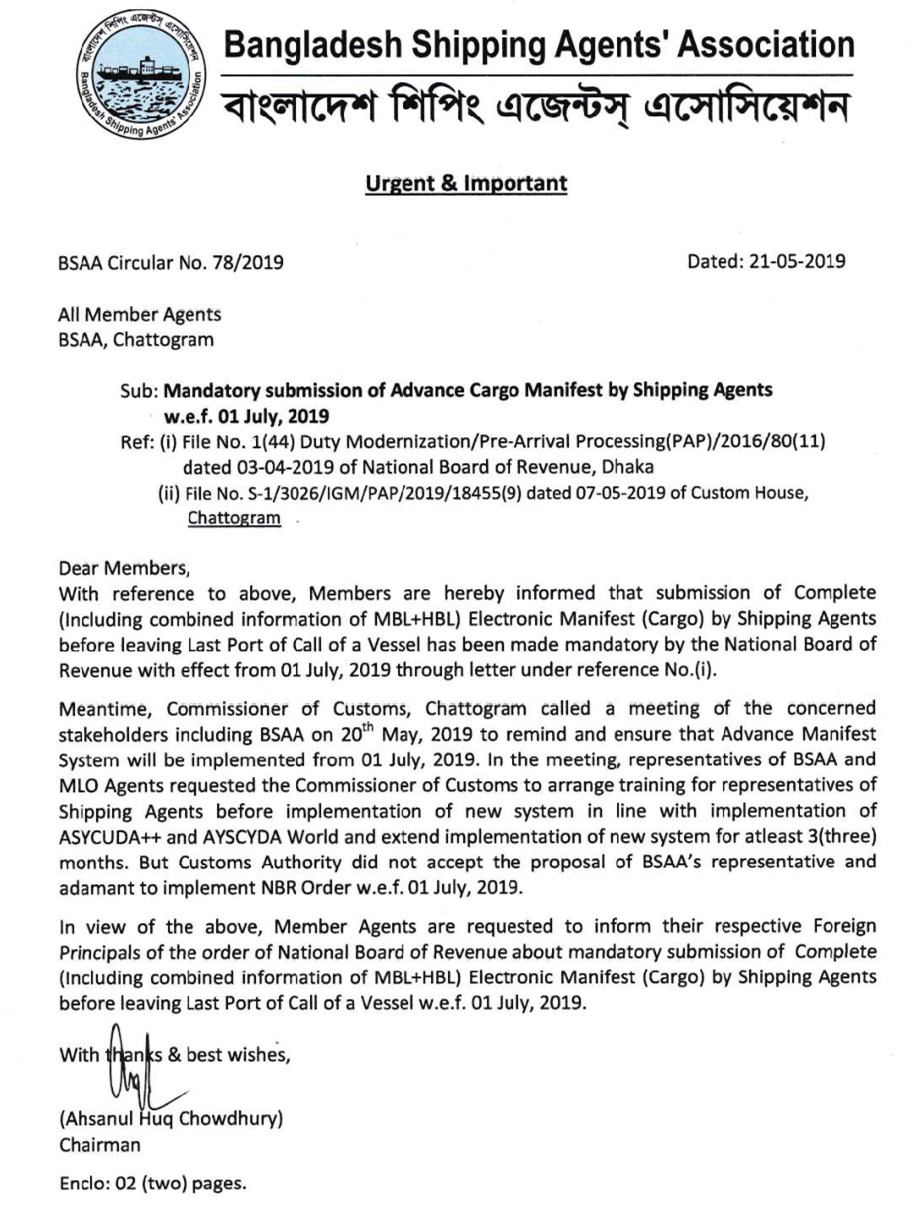With reference to above, Members are hereby informed that submission of Complete (lncluding combined information of MBL+HBL) Electronic Manifest (Cargo) by Shipping Agents before leaving Last Port of Call of a Vessel has been made mandatory by the National Board of Revenue with effect from 01 July, 2019 through letter under reference No.(i).