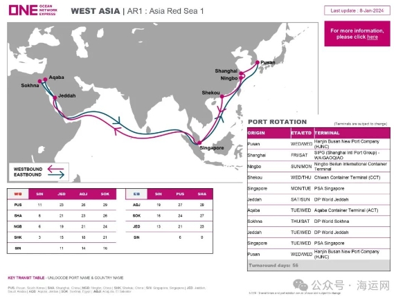 ONE于1月25日宣布,鑒于近期紅海周邊的安全局勢發(fā)展,將暫停AR1服務(wù),直至另行通知。這是一項(xiàng)積極主動(dòng)的措施,旨在優(yōu)先考慮船員、船舶和貨物的安全。