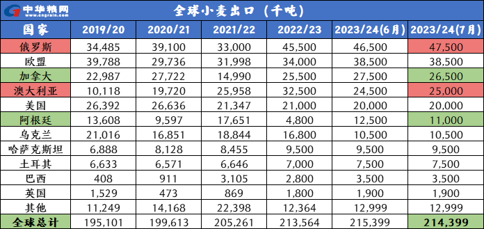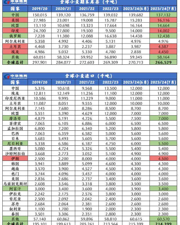 進(jìn)口下調(diào):2023/24年度全球小麥進(jìn)口量2.14億噸,下調(diào)100萬(wàn)噸。