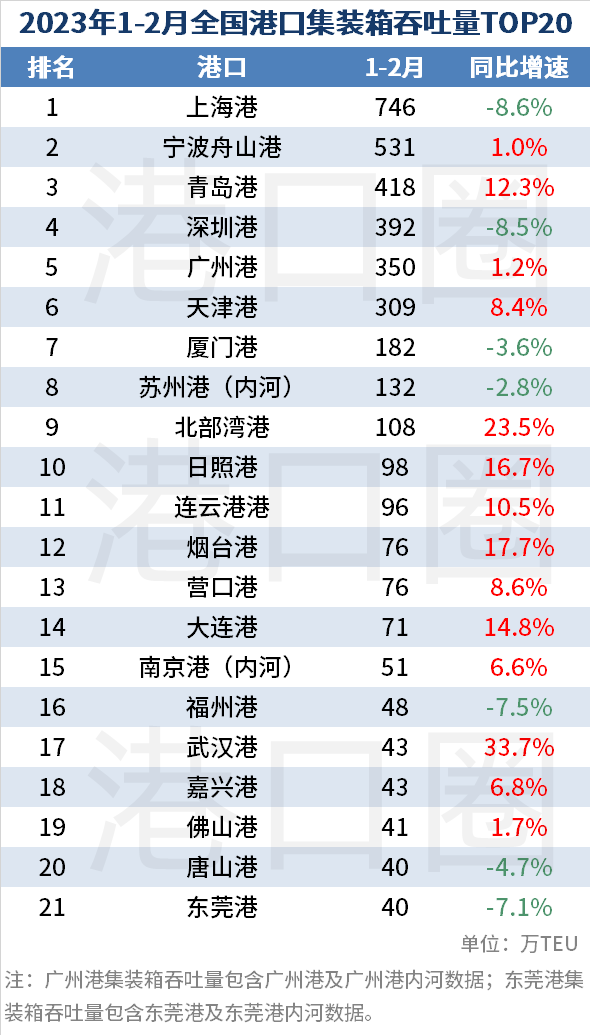 1-2月,全國港口集裝箱吞吐量前十名為:上海港(第1)、寧波舟山港(第2)、青島港(第3)、深圳港(第4)、廣州港(第5)、天津港(第6)、廈門港(第7)、蘇州港(第8)、北部灣港(第9)、日照港(第10)。