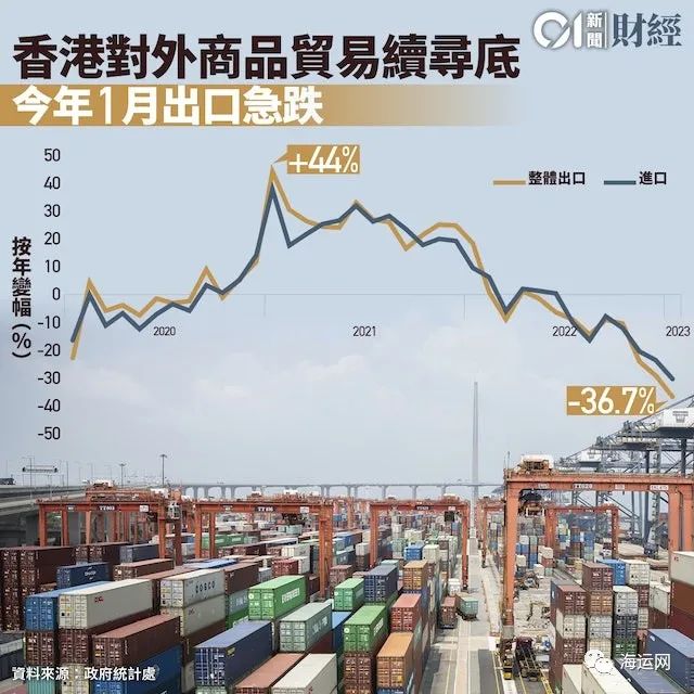 受到全球需求疲軟及農(nóng)歷春節(jié)假期雙重影響,香港2023年1月出口比去年同期下跌36.7%至2909億港元,創(chuàng)下1953年9月以來即70年來最大跌幅。