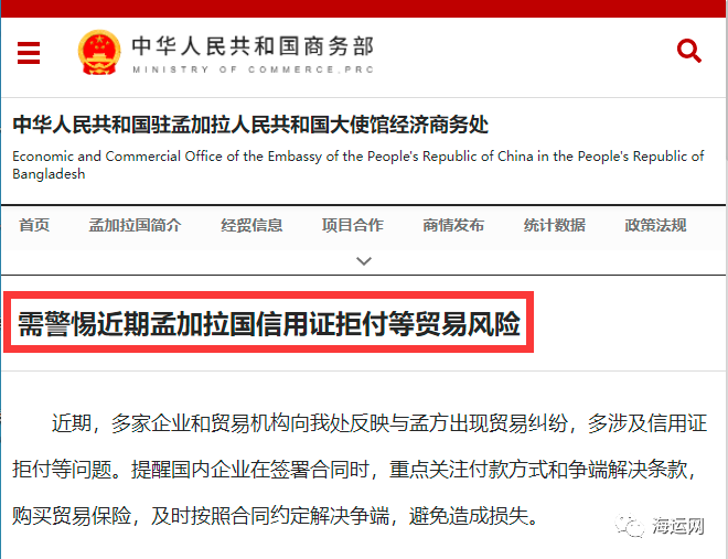 日前,中華人民共和國駐孟加拉人民共和國大使館經(jīng)濟商務處發(fā)布安全風險提醒:近期,多家企業(yè)和貿(mào)易機構向我處反映與孟方出現(xiàn)貿(mào)易糾紛,多涉及信用證拒付等問題。提醒國內(nèi)企業(yè)在簽署合同時,重點關注付款方式和爭端解決條款,購買貿(mào)易保險,及時按照合同約定解決爭端,避免造成損失。