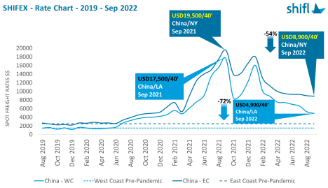 “金九銀十”的說(shuō)法在全球海運(yùn)業(yè)曾經(jīng)也同樣適用,不過(guò)在今年的傳統(tǒng)旺季,海運(yùn)市場(chǎng)卻遭受陣陣寒流。主要海運(yùn)航線(xiàn)的運(yùn)價(jià)“斷崖式”暴跌,去年一飛沖天的海運(yùn)市場(chǎng)徹底“涼”了,現(xiàn)在海運(yùn)市場(chǎng)已經(jīng)從“賣(mài)方市場(chǎng)”轉(zhuǎn)變成為“買(mǎi)方市場(chǎng)”了。