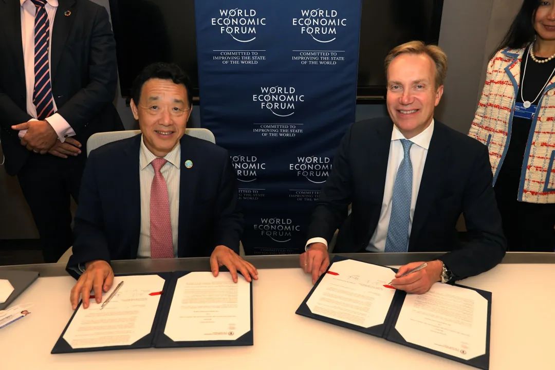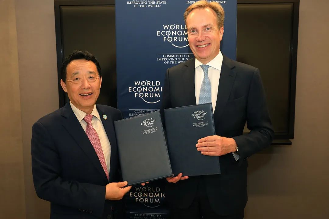 聯(lián)合國糧農(nóng)組織總干事屈冬玉和世界經(jīng)濟(jì)論壇總裁博爾格·布倫德簽署《意向書》。?糧農(nóng)組織