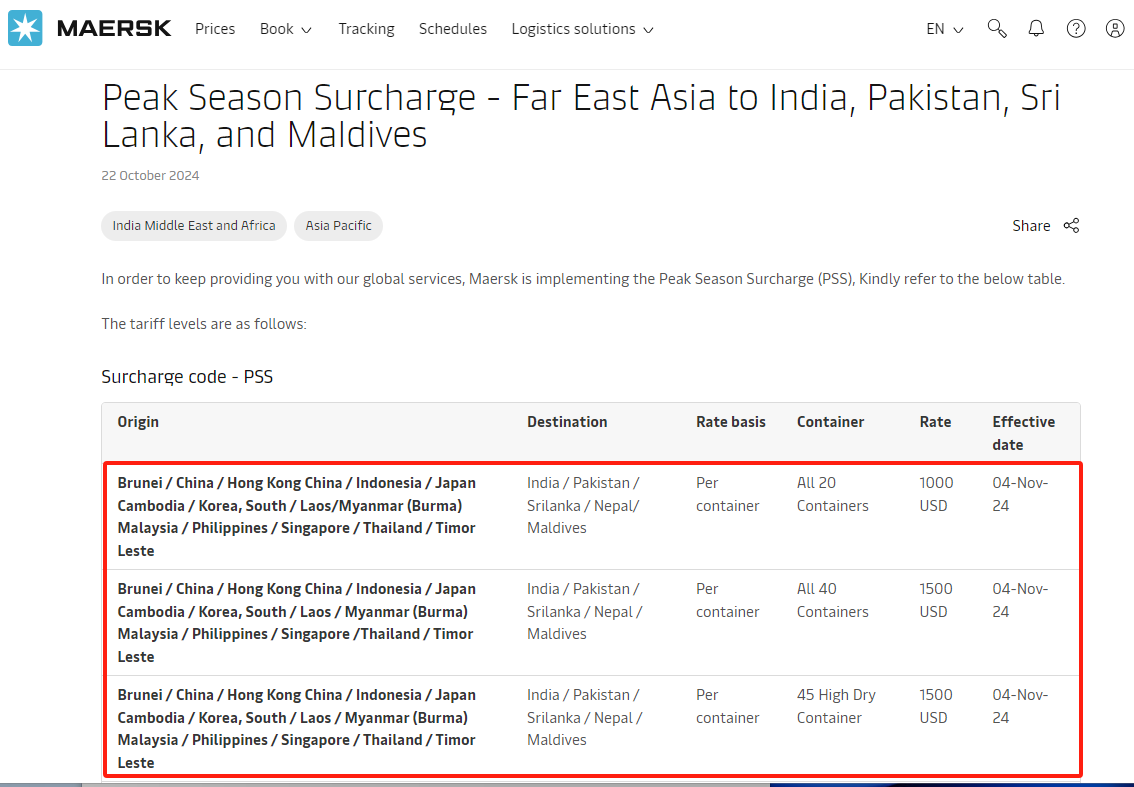 2024年11月4日起,馬士基征收遠(yuǎn)東至印度、巴基斯坦、斯里蘭卡和馬爾代夫等的旺季附加費(fèi)PSS,20尺柜1000美元。40和45尺高柜1500美元。具體如下: