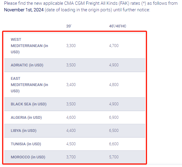 達(dá)飛輪船于22日發(fā)布公告稱,自2024年11月1日(裝貨日期)起,至另行通知為止,將對(duì)從亞洲運(yùn)往地中海和北非地區(qū)(涵蓋亞得里亞海、黑海以及阿爾及利亞、利比亞、突尼斯、摩洛哥等國(guó)家)的貨物實(shí)施新的FAK費(fèi)率,最高可達(dá)6900美元。具體費(fèi)率細(xì)節(jié)如下: