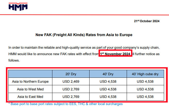 21日,韓新海運(yùn)(HMM)發(fā)布公告,宣布為維持其可靠且高質(zhì)量的服務(wù)水平,自2024年11月1日起實(shí)施新的亞洲至歐洲及地中海地區(qū)的貨運(yùn)按重量或體積計(jì)費(fèi)(FAK)費(fèi)率,該費(fèi)率將持續(xù)至另行通知。具體詳情如下:
