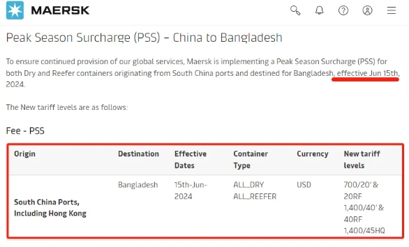 馬士基宣布,從2024年6月15日起對(duì)從華南港口出發(fā)前往孟加拉國的干貨集裝箱和冷藏集裝箱征收旺季附加費(fèi)(PSS),20尺干箱盒冷藏箱700美元,40尺干箱和冷藏箱及45尺HQ1400美元。詳情如下: