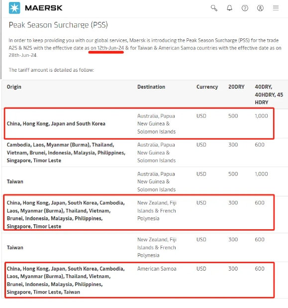 馬士基宣布,從6月12日起對(duì)中國至澳大利亞、巴布亞新幾內(nèi)亞和所羅門群島的A2S和N2S貿(mào)易航線征收旺季附加費(fèi)。具體收費(fèi)標(biāo)準(zhǔn)如下: