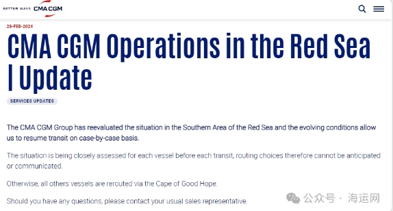今年2月2日,由于多艘船舶在紅海地區(qū)遭受襲擊和未遂襲擊,達飛輪船暫停了在該地區(qū)的航行。