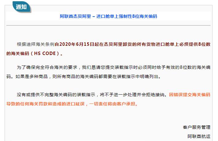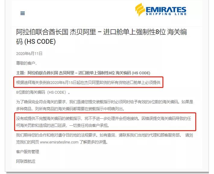 根據(jù)迪拜海關(guān)條例自2020年6月15日起在杰貝阿里卸貨的所有貨物進口艙單上必須提供8位數(shù)的海關(guān)編碼(HS CODE)。為了確保完全符合海關(guān)的要求,在提交裝載指示時必須同時給予有效的8位數(shù)的海關(guān)編碼。如果是多種商品,則所有商品的海關(guān)編碼都需要在裝載指示中明確列出。