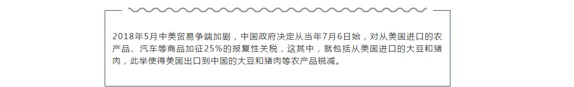 2018年5月中美貿(mào)易爭端加劇,中國政府決定從當年7月6日始,對從美國進口的農(nóng)產(chǎn)品、汽車等商品加征25%的報復性關稅,這其中,就包括從美國進口的大豆和豬肉,此舉使得美國出口到中國的大豆和豬肉等農(nóng)產(chǎn)品銳減。