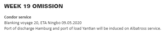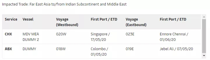東岸中國 2 (ECC2) 掛靠次序: 青島 > 寧波 > 上海 > 釜山 > 科隆 > 薩凡納 >查爾斯頓 > 波士頓 > 紐約 > 科隆 > 青島 取消于 四月二十八日 由青島出發(fā)的航次 東岸快航 1 (ECX1) 掛靠次序: 蓋梅港 > 香港 > 鹽田 > 廈門 > 上海 > 科隆 > 紐約 > 薩凡納 >查爾斯頓 > 蓋梅港 取消于 四月十六日四月十三日及四月二十七日 由蓋梅港出發(fā)的航次