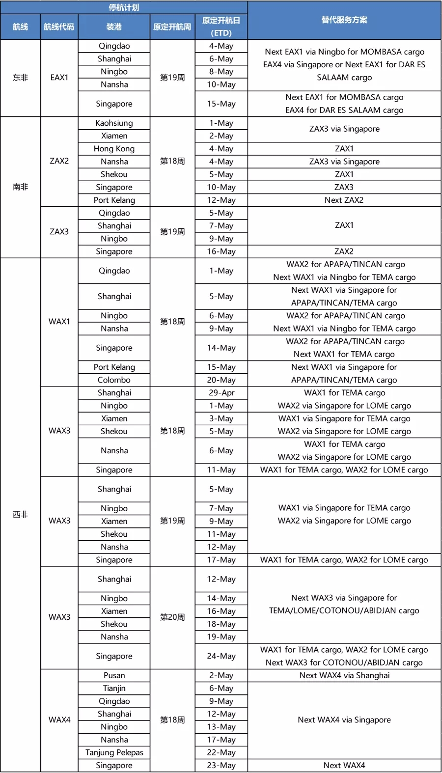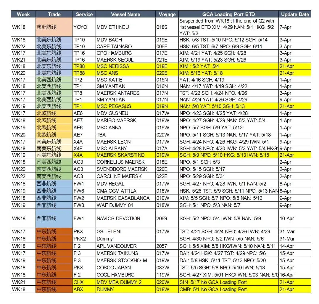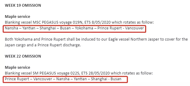 越南中國服務(wù) (VCS) 掛靠次序( 至四月三十日 ) : 林查班 > 蓋梅港 > 海防 > 南沙 > 香港 > 鹽田 > 長灘 > 奧克蘭 > 連云港 > 上海 掛靠次序( 五月一日起生效 ) :林查班 >海防 >上海 > 寧波 > 長灘 > 奧克蘭 > 連云港 > 上海 取消于 四月二十三日 由南沙出發(fā)及 五月十五日由上海出發(fā) 的航次 太平西北1 (PNW1) 掛靠次序: 蛇口 > 香港 > 鹽田 > 高雄 > 溫哥華 > 西雅圖 > 釜山 > 高雄 > 蛇口 取消于 五月二日 由蛇口出發(fā)的航次